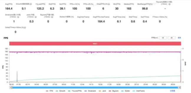半小时烽火地带平均 164.4 帧,功耗 4.3W。